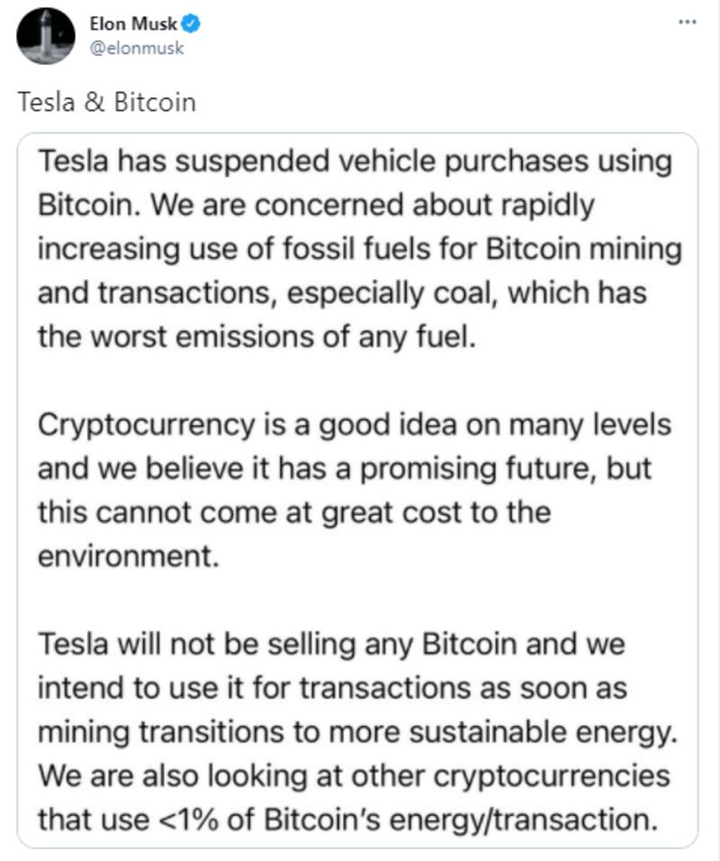 El director ejecutivo de Tesla, Elon Musk, anunció que el fabricante de vehículos eléctricos suspenderá las compras con bitcoin, desencadenando una estrepitosa caída en el valor de la criptomoneda.