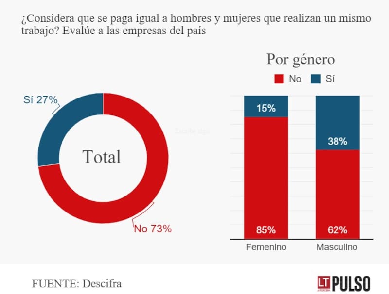 Frente a la pregunta de si se considera que las empresas en el país pagan igual a hombres y mujeres que realizan un mismo trabajo, ya la percepción general es mayoritariamente negativa, con un 73% que señala que no, y un 27%, que sí.