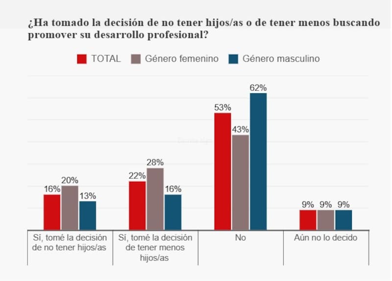 De todos modos, un 53% de los consultados dice que no ha tomado la decisión de no tener hijos/as o de tener menos para fortalecer su carrera.