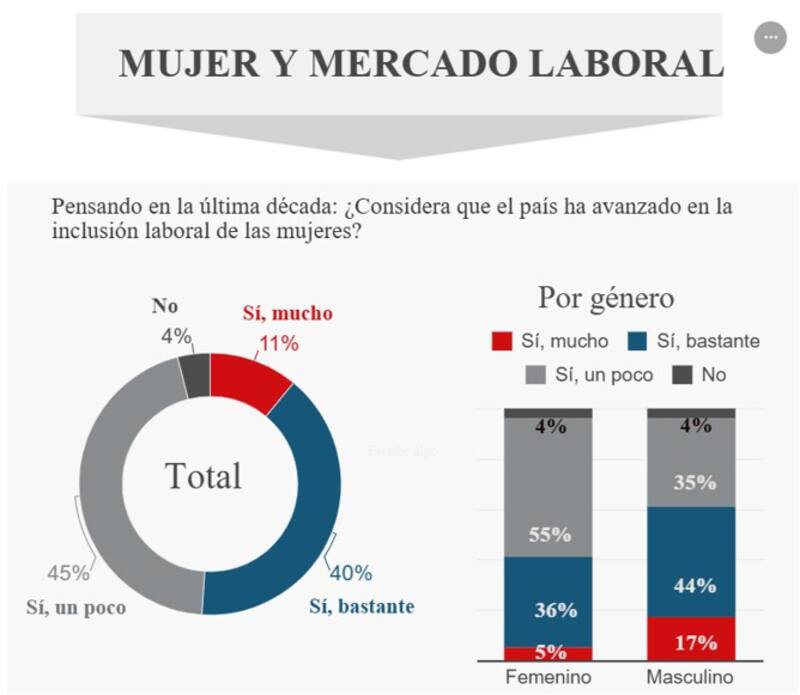 Ya en la primera pregunta sobre si el país ha avanzado en la inclusión laboral femenina durante la última década, se observa la distinta percepción entre mujeres y hombres. Mientras en la muestra total la suma de quienes ven mucho/ bastante avance es del 51%, en el caso de las mujeres ese porcentaje baja al 41%, y en el caso de los hombres sube al 61%. Es decir, hay una diferencia de 20 puntos porcentuales entre ambas miradas.