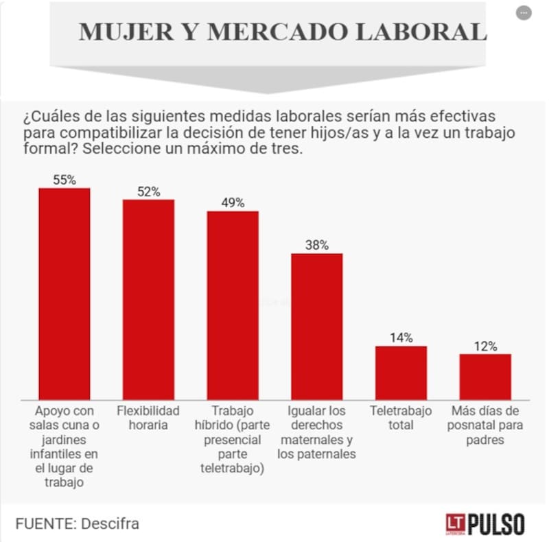 En ese sentido, el 55% de los encuestados cree que el apoyo con salas cunas es una medida efectiva para compatibilizar la decisión de tener hijos y el trabajo formal. Esto, seguido de la flexibilidad horaria, con el 52%, y trabajo híbrido, con el 49%. En el caso de los hombres, prefieren apoyo con salas cunas (58%), mientras que en el de las mujeres hay tres medidas que obtienen un porcentaje similar: flexibilidad laboral (53%), sala cuna (52%) y trabajo híbrido (51%).