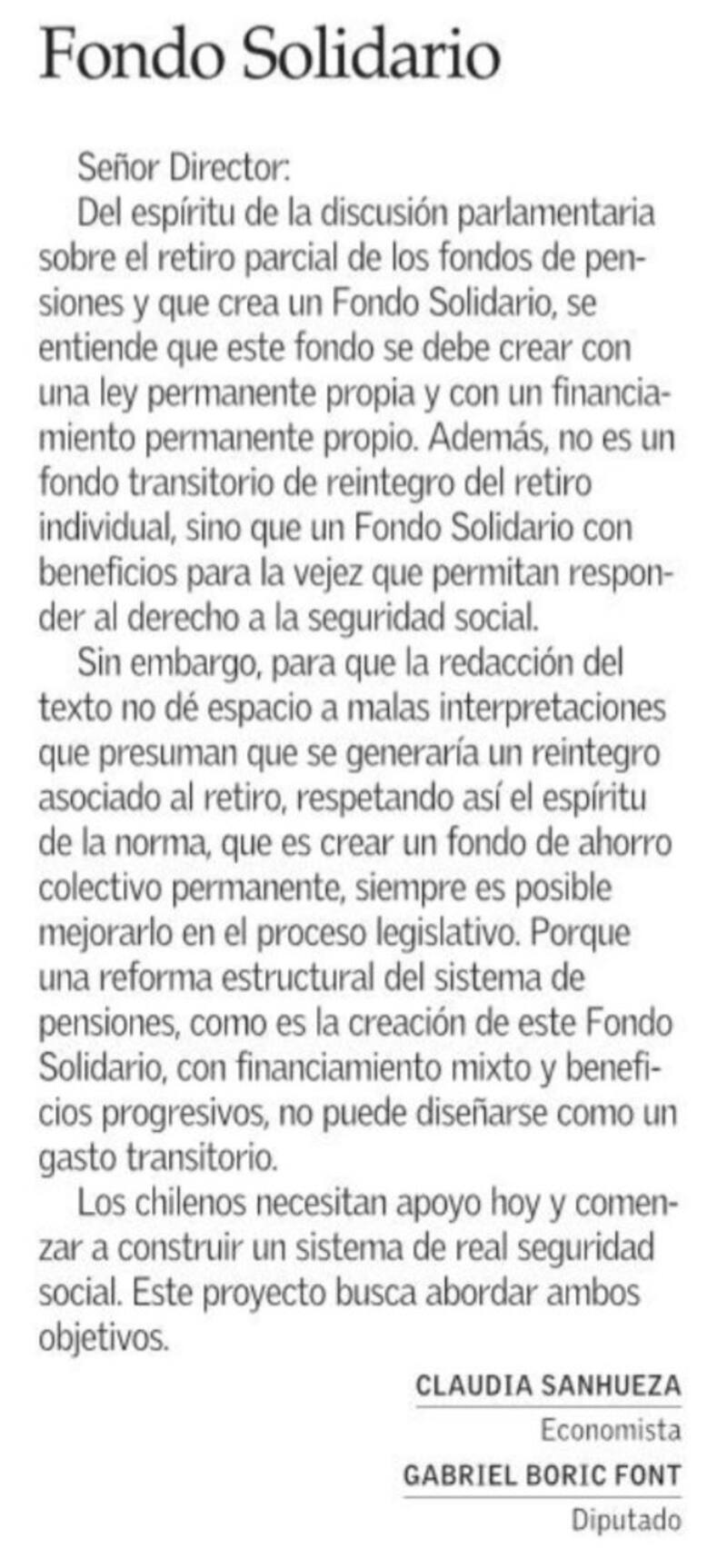Y aunque no quiso entrar en polémicas, el secretario de Estado no pudo evitar la crítica hacia la propuesta que hizo el diputado Gabriel Boric y la economista ligada al Frente Amplio, Claudia Sanhueza. En una carta a El Mercurio, ambos plantearon que el Fondo Solidario para la reposición de las pensiones (uno de los pilares del proyecto de retiro) se debe crear con una ley permanente propia y con un financiamiento permanente propio. Más aún, para ellos, no se trata de un fondo transitorio, sino que la idea es que sea un fondo de ahorro colectivo permanente, lo cual supone el uso permanente de recursos fiscales.