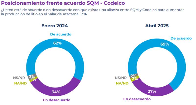 De acuerdo a la medición, un 69% de los encuestados (701 casos) se mostró de acuerdo con la existencia de una alianza entre la minera privada, ligada al grupo Pampa, y la minera estatal chilena, para que exploten en forma conjunta el salar de Atacama hasta el 2060. En contraste, un 27% está en desacuerdo con la alianza. Ambos porcentajes mostraron cambios a favor del pacto desde la última consulta al respecto, realizada en enero, cuando las preferencias fueron de 62% y 34%, respectivamente.