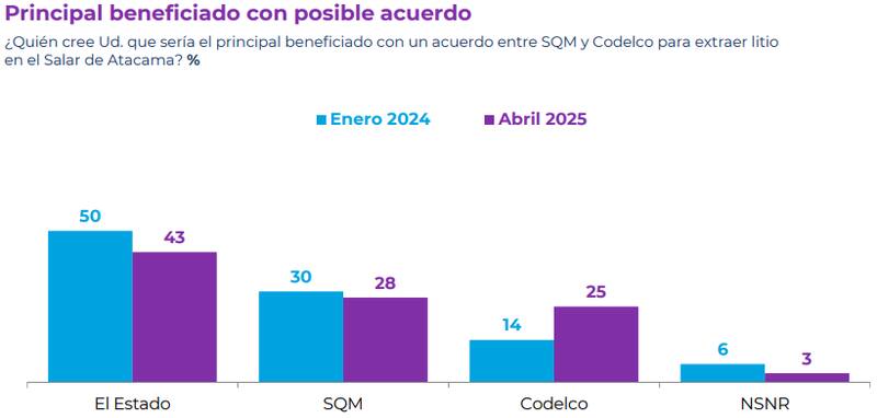 Finalmente el sondeo recoge, además, la evaluación que realizan los encuestados sobre quién es el principal beneficiado con la asociación entre la estatal y la privada. En dicho apartado, el Estado asoma con la parte que obtiene más provecho, con el 43% de las preferencias (50% en enero), seguido por SQM con el 28% (30% en enero) y Codelco, con el 25%.