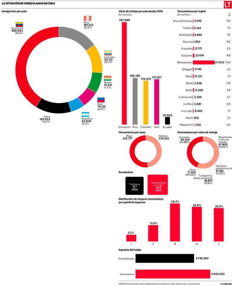 Según datos del Departamento de Extranjería e Inmigración, desde 2014 se han entregado 397.988 visas relacionadas con trabajo a personas provenientes de Venezuela, entre las que se cuentan las “Sujetas a contrato”, “Por motivos laborales”, “Beneficio Mercosur”, “Profesionales y Técnicos” y de “Inversionista”. Le siguen las personas de Perú, con 180.785, y Haití, con 175.997.