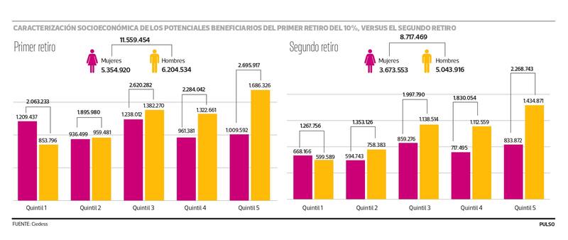 Según Ciedess, el total de los beneficiarios del segundo retiro sería de 8,7 millones y aumentarían los de los quintiles 4 y 5. En el caso de las mujeres, caerían de 46% a 42% respecto de la primera vez.