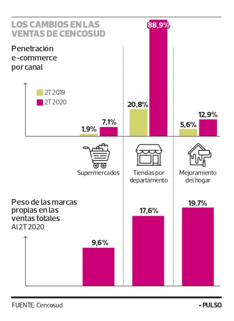 Es el caso de Cencosud, que integra los negocios de supermercados, tiendas por departamento y mejoramiento del hogar en Chile, Perú, Colombia, Argentina y Brasil, la pandemia llevó a que las ventas por internet se dispararan a 88,9% del total, en el caso de las tiendas por departamento en el segundo trimestre de 2020, un peso más de cuatro veces mayor al que tenía en igual período del año anterior.