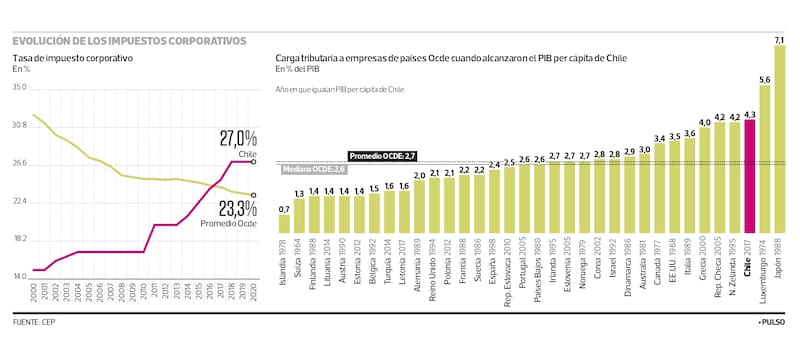 El impuesto corporativo a las empresas en Chile ha ido en constante aumento en los últimos 20 años, pasando del 15% en 2000 al 27% de hoy, en dirección opuesta a lo que ha pasado con la tasa promedio de los países de la Ocde.