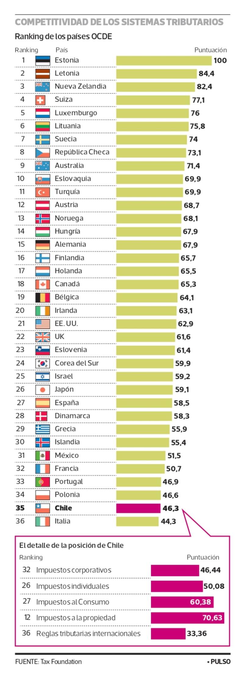 Con 46,3 puntos promedio, de un máximo de 100, solo se supera a Italia en un ranking que lideran Estonia, Letonia y Nueva Zelandia y que da cuenta de cuán atractiva es una nación en materia tributaria para la inversión extranjera. Así, en el detalle, Chile supera los 60 puntos en materia de impuestos al consumo y a la propiedad, quedando rezagado en impuestos individuales, corporativos y reglas internacionales.
