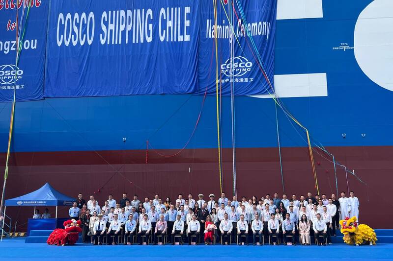 “Estoy muy orgullosa de ser la madrina de Cosco Shipping Chile, el cual, es el último barco de una serie de 6 embarcaciones de esta naviera. Tiene 14.100 TEUs y su diseño demoró cerca de un año y 14 meses en ser construido. Este 25 de septiembre será su primera prueba en el mar, la que dura cinco días, y si todo sale bien este 25 de octubre partirá a Shanghái y luego a Sudamérica”, puntualizó Soler, quien encabezó el corte de cinta.