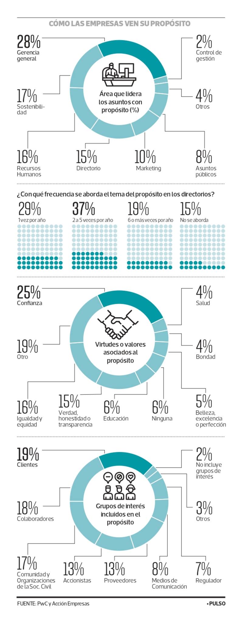 Según un estudio desarrollado por PwC y Acción Empresas a 53 compañías de 22 industrias, el 87% de ellas afirmó tener un propósito explícitamente declarado y alineado con su estrategia de sostenibilidad, donde los grupos de interés pasan a ser cada vez más relevantes.