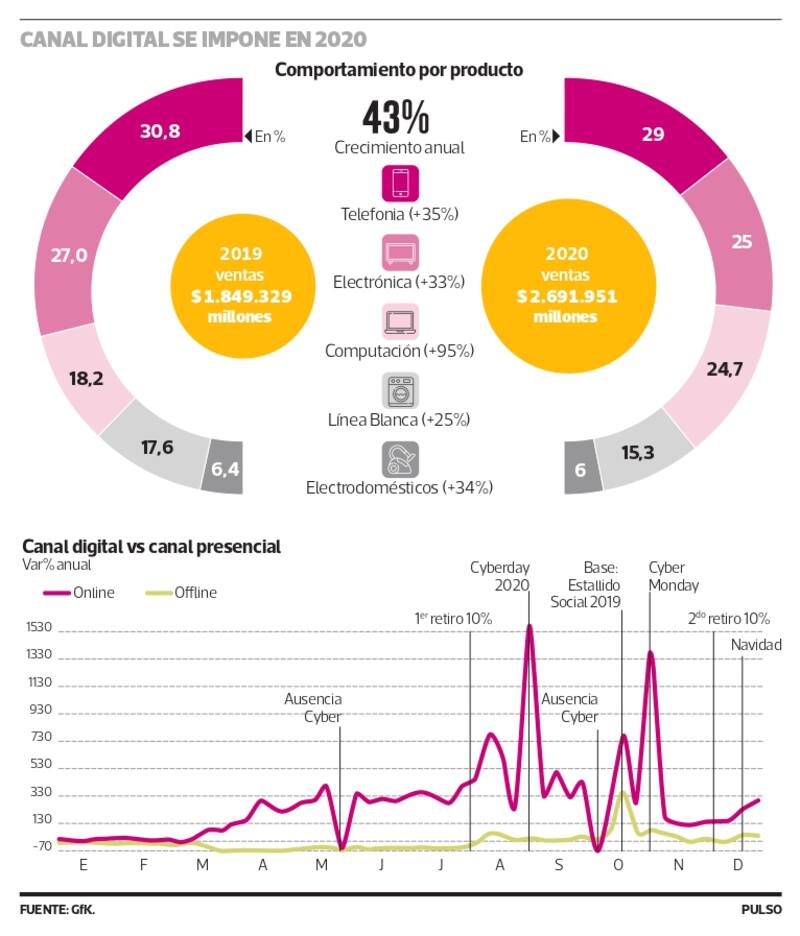 Este dinamismo estuvo principalmente impulsado por la categoría de computación, que creció +95%, y pasó de representar un 18,2% del mercado en 2019 a 24,7% en 2020. Le sigue telefonía (+35%), electrodomésticos (34%), electrónica (33%) y línea blanca (25%).