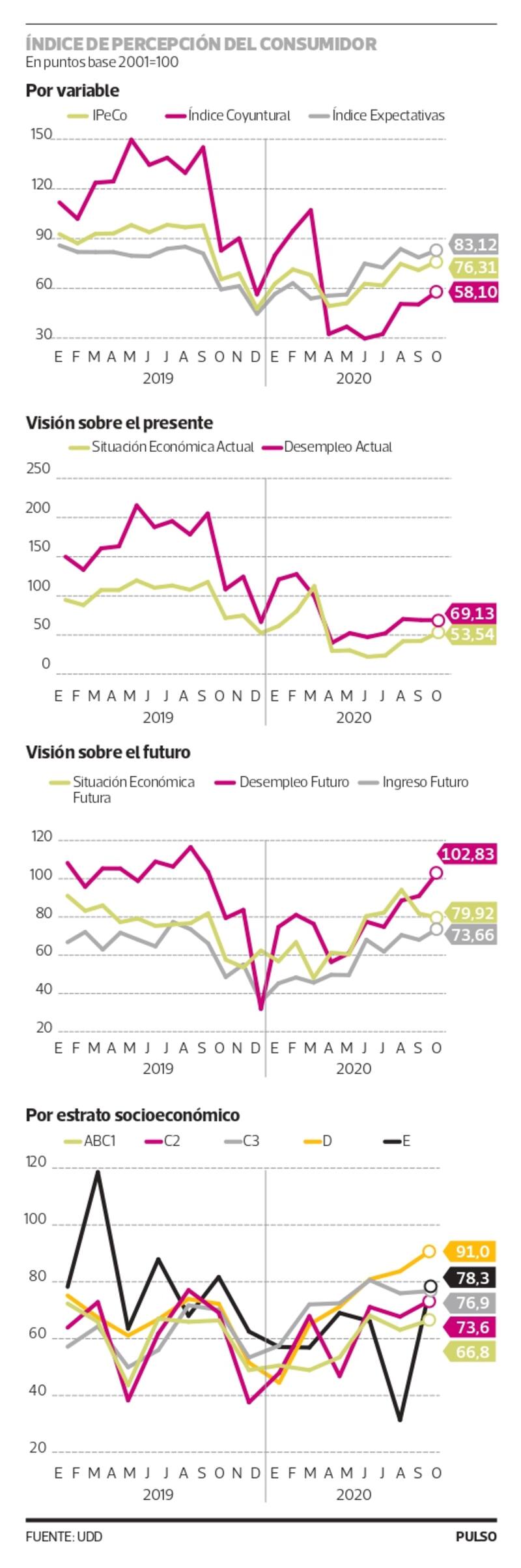 Contrario a la caída que sufrió la confianza de los consumidores en septiembre, la reciente medición del Índice de Percepción del Consumidor (Ipeco) en octubre dio cuenta de un alza de 5,1 puntos respecto al mes de las Fiestas Patrias. En los últimos 12 meses ha trepado 10,6 puntos.