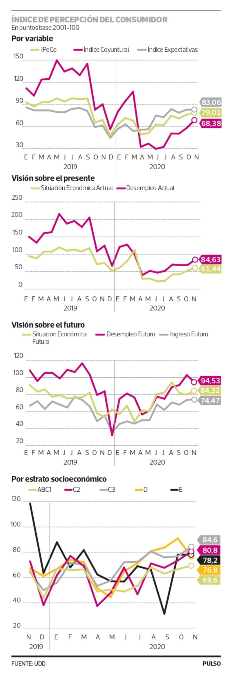 Una menor contracción de la actividad económica informada el mes pasado para el Imacec de septiembre, la recuperación de puestos de trabajo en los dos últimos trimestres, sumado a un escenario mejor a lo esperado en términos de la pandemia tras el anuncio de Pfizer, fueron también los factores que hicieron que el Índice de Percepción del Consumidor (Ipeco) avanzara 2,7 puntos, hasta situarse en 79 puntos en noviembre. En los últimos doce meses, ha aumentado 9,8 puntos.