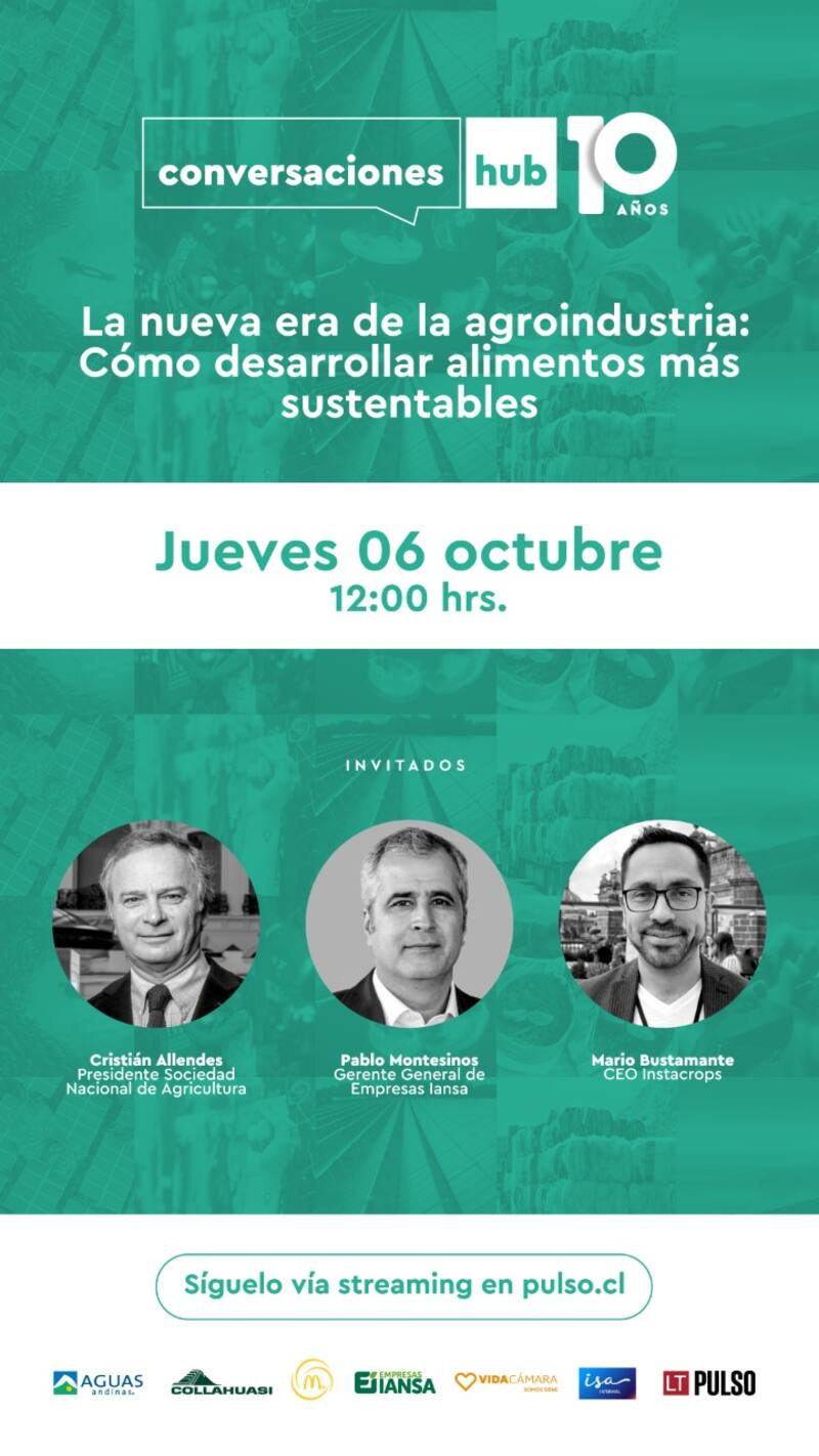 Cristián Allendes, presidente de la sociedad Nacional de Agricultura; Pablo Montecinos, gerente general de Empresas Iansa y Mario Bustamante, CEO de Instacrops serán los próximos invitados al conversatorio el día jueves 6 de octubre a las 12:00 en los estudios de Pulso La Tercera.