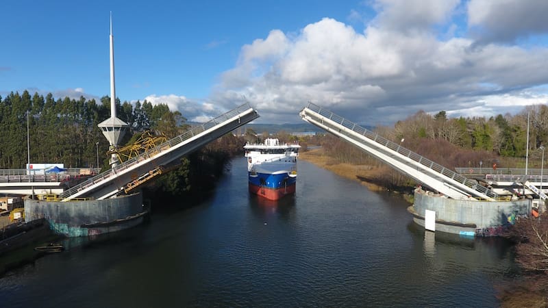 Símbolo de mala gestión, el puente tuvo que ser reacondicionado y el Estado debió cambiar el diseño de la infraestructura con un costo de más de $12 mil millones. Durante 2024 y este año el puente ya ha estado operando correctamente para el tráfico marítimo.