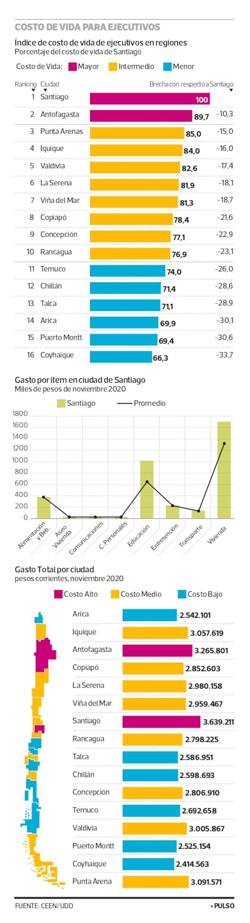 El ranking de las capitales regionales más caras en cuanto a costo de vida está separado en tres grupos, el de Mayor Costo de Vida, el de Costo de Vida Intermedio y el de Costo de Vida Bajo. El primero lo encabeza Santiago, con $3.639.311, superando en 10,3% a Antofagasta, que se encuentra segundo. En el grupo intermedio están Punta Arenas, Iquique, Valdivia, La Serena, Viña del Mar, Copiapó, Concepción y Rancagua, en ese orden. Por último, el grupo con menor costo de vida lo integran Temuco, Chillán, Talca, Arica, puerto Montt y Coyhaique. La diferencia entre Santiago y Coyhaique es de un 33,7%.