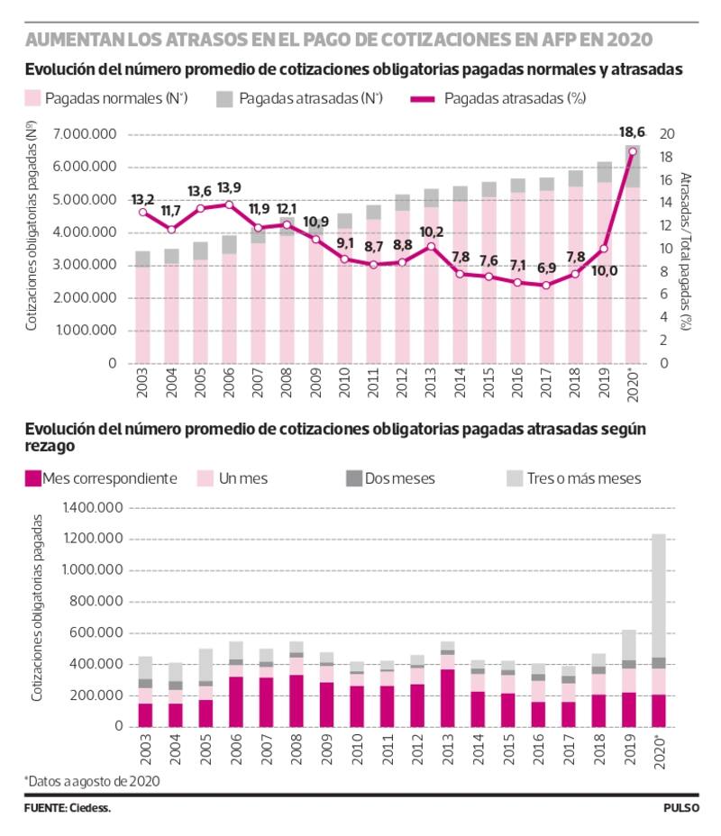 Un salto significativo ha experimentado este año el pago atrasado de las cotizaciones en AFP. Así lo refleja un estudio hecho por Ciedess, donde muestra que “el nivel de cotizaciones pagadas atrasadas estuvo relativamente estable hasta 2018, presentando un ligero incremento en 2019, mientras que en lo que va de 2020 muestra un salto significativo, con una mayor proporción de pagos atrasados por tres o más meses”.