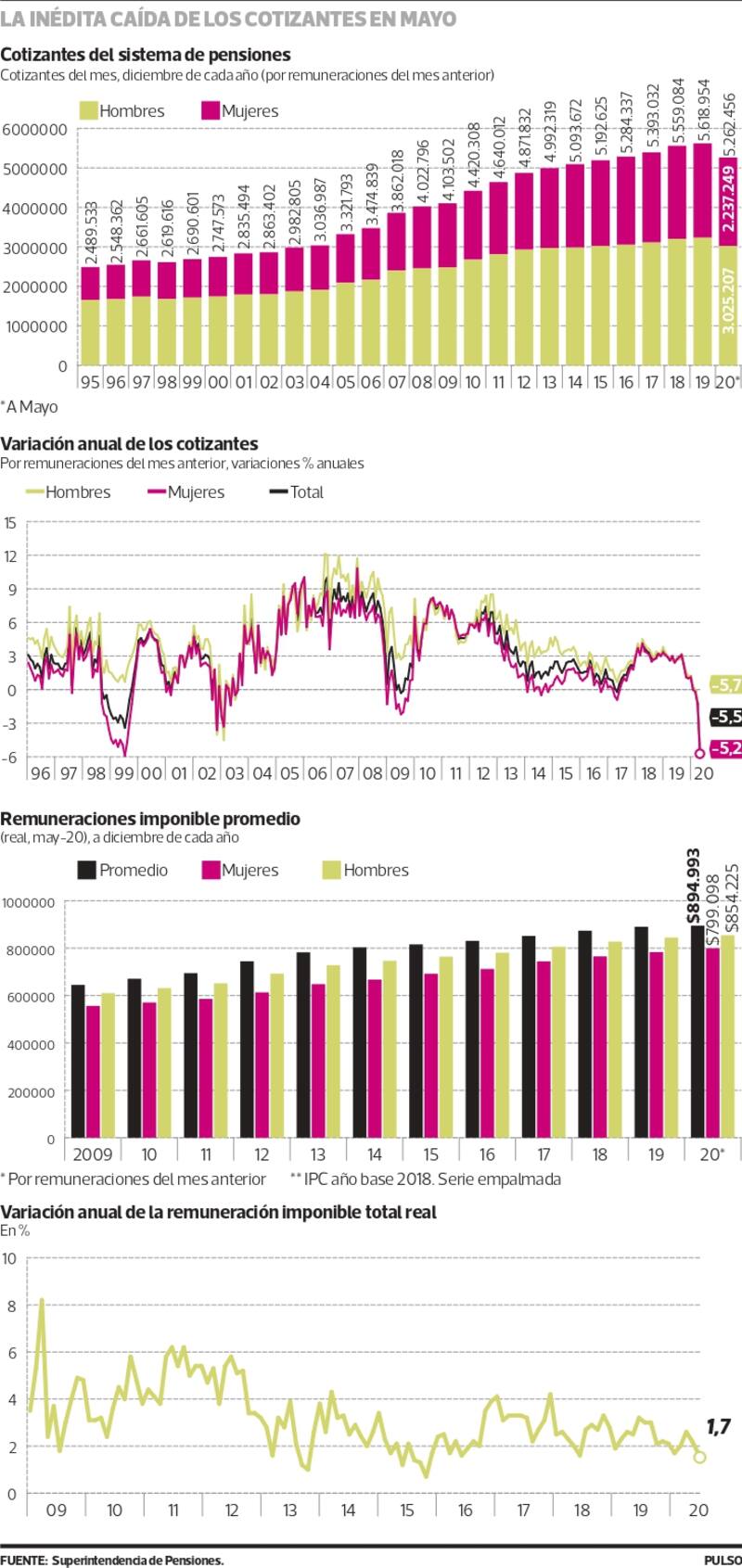 En concreto, una minuta de la Superintendencia de Pensiones revela que en el quinto mes los cotizantes del sistema de pensiones cayeron 5,5% año contra año, a 5.262.456 personas. Esta es “la mayor disminución desde que se tiene registro de la evolución de los cotizantes del sistema”, dice el regulador en el documento. El registro inició en 1995. Y esto solo refleja una parte de las secuelas de la crisis sanitaria, ya que las cifras de mayo corresponden a las cotizaciones pagadas por las remuneraciones de abril.