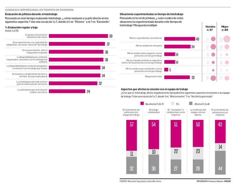 La investigación se basó en una encuesta sobre la opinión de los trabajadores chilenos y de las jefaturas, a la hora de desempeñarse por medio del trabajo a distancia en el contexto del Covid. La muestra -que consideró a 300 personas- reveló que la experiencia del trabajo remoto no ha tenido impacto negativo en cuanto a relaciones interpersonales, considerando el sentimiento de pertenencia al equipo de trabajo, el trabajo colaborativo, el compromiso con la empresa y la confianza en los líderes.