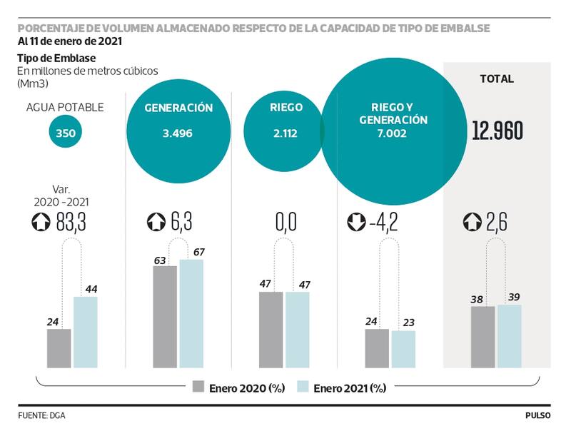 El tema no es menor si consideramos que aunque 2020 fue un poco más lluvioso que el 2019, sigue habiendo un déficit de lluvias y de las capacidades de los embalses. Si bien el último Informe Semanal HidroMeteorológico de la Dirección General de Aguas (DGA) indica que ha aumentado el volumen acumulado en los embalses a enero de 2021, con respecto al año anterior (ver gráfico), debemos acostumbrarnos a vivir con un clima más seco.
