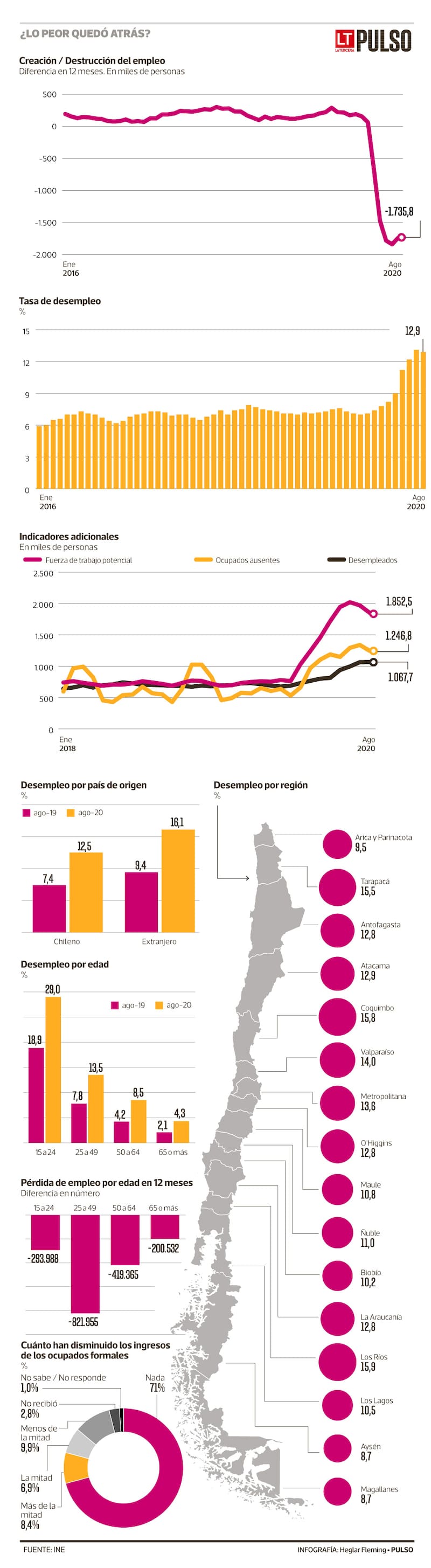 La tasa de desempleo llegó en el trimestre móvil junio-agosto a 12,9%, 5,4 puntos porcentuales mayor a la del mismo período del año pasado, pero 0,2 pp menos que lo registrado en el período mayo-julio. Esta es la primera baja mensual que se registra en ese indicador desde noviembre pasado, según los datos del INE.