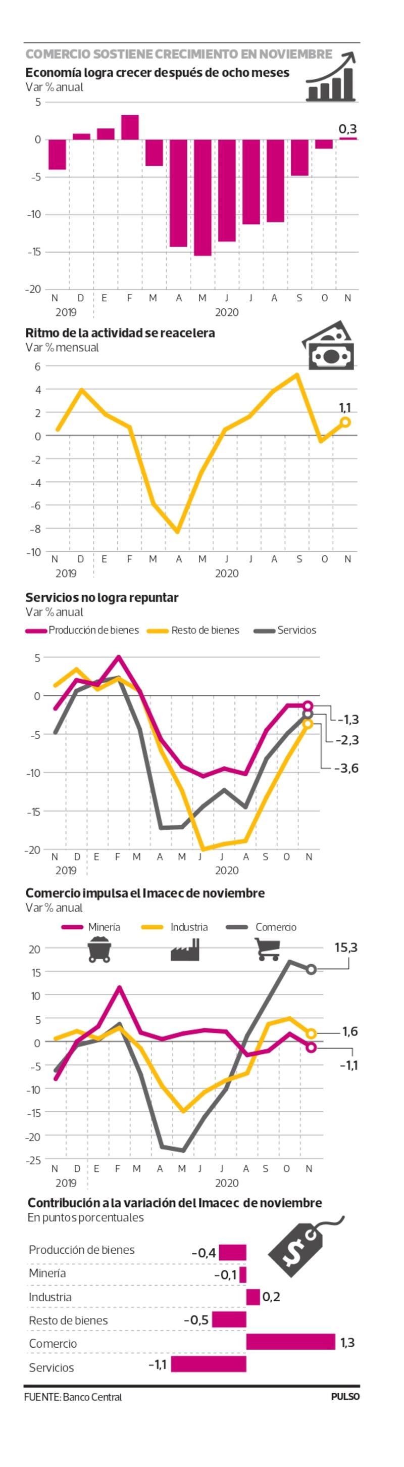 De acuerdo al Banco Central, en noviembre el Imacec subió 0,3%, impulsado por el comercio, que tuvo un alza de 15,3%. Estos positivos números fueron contrastados por el mal rendimiento que sigue teniendo los sectores ligados a servicios. En términos desestacionalizados el crecimiento volvió a niveles de marzo.