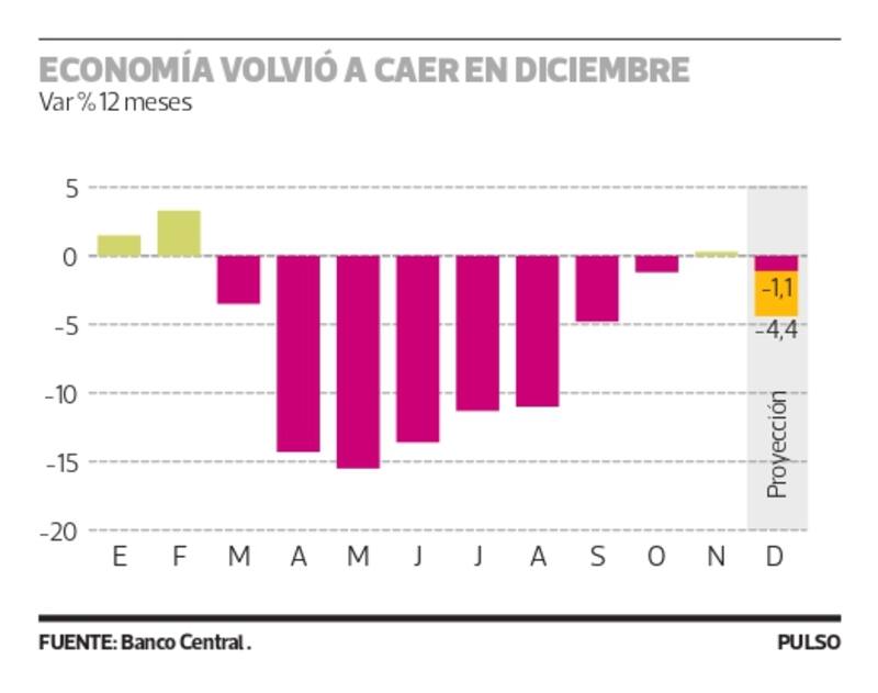 Con estas cifras sobre la mesa, los expertos confirmaron lo que ya estaba anticipando: la actividad en diciembre volvería a caer luego de la leve alza que hubo en noviembre de 0,3%. Para el último mes del año, los economistas prevén que el Imacec registre una contracción de entre 1,1% y 4,4%.