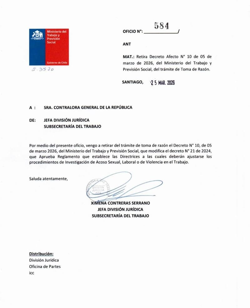 La iniciativa buscaba modificar el reglamento vigente sobre los procedimientos de investigación de acoso sexual, laboral y violencia en el trabajo bajo la Ley Karin. Contactado por La Tercera, el subsecretario del Trabajo, Gustavo Rosende, apuntó que la normativa "sigue plenamente vigente y no se está debilitando ninguna obligación".