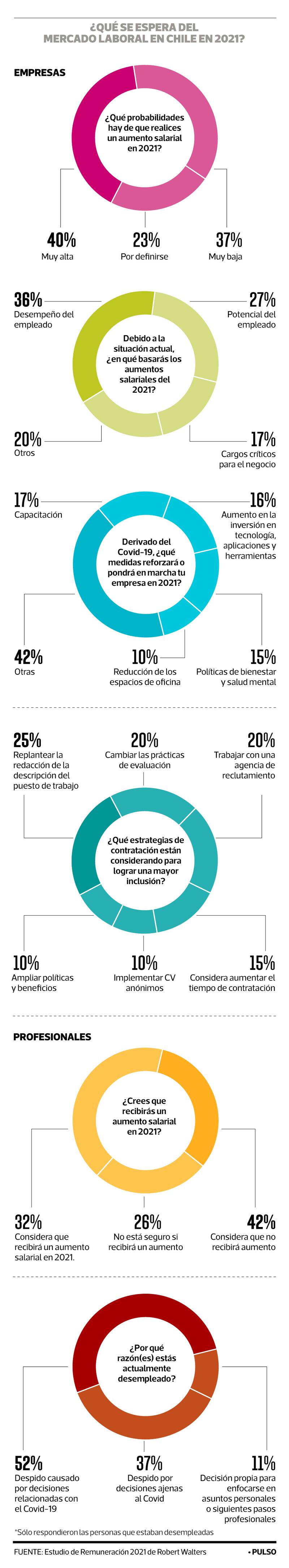 En esta línea, el Estudio de Remuneraciones 2021 elaborado por Robert Walters, consultora especializada en Recursos Humanos, arrojó que el 40% de las empresas está considerando entregar aumentos salariales este año. Mientras que 37% ve una posibilidad muy baja de hacerlo y 23% aún debe definirlo.