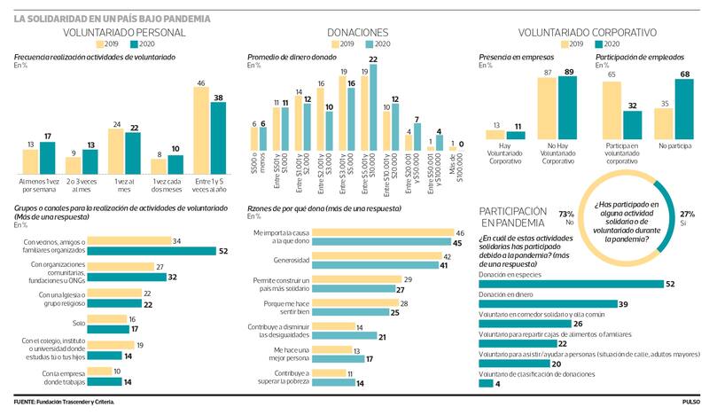 Esto es parte de los resultados de la 12ª versión de la Encuesta Nacional de Voluntariado y Solidaridad desarrollada por Fundación Trascender. El informe entrega reveladores datos sobre la actitud solidaria de la sociedad chilena en el contexto de una crisis sanitaria y económica provocada por la pandemia del Covid-19. De hecho, entre los encuestados que declararon haber realizado voluntariado en los últimos 12 meses, el 43% lo hizo en alguna actividad relacionada con la pandemia, como apoyo en un comedor solidario u olla común, la repartición de cajas de alimentos o la entrega de asistencia a personas. Incluso, disminuyó de 40% a 26% la cantidad de personas que señalaron como razón para no hacer voluntariado la falta de tiempo.