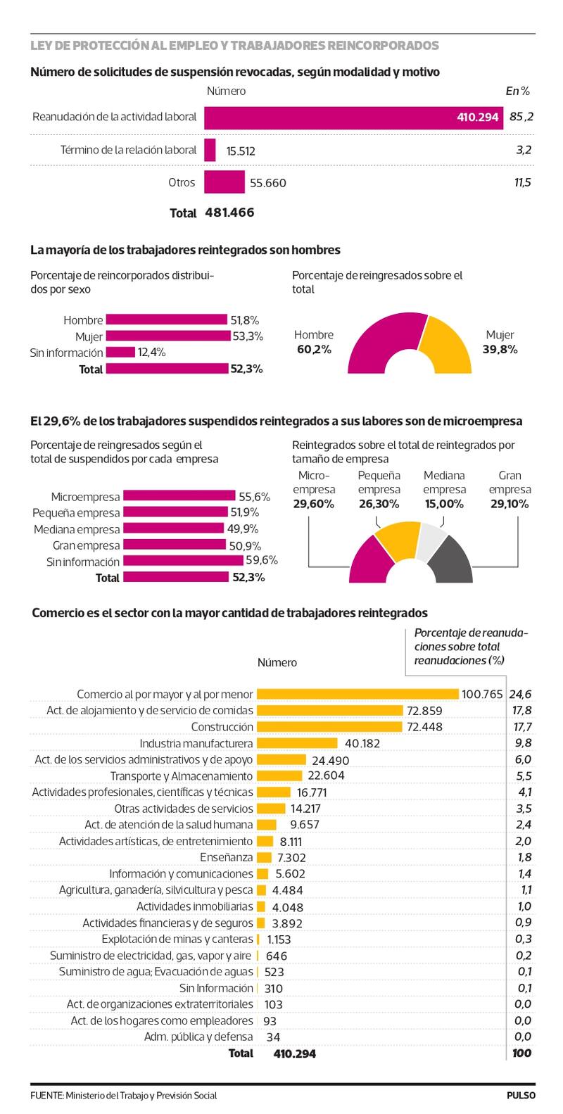 La reapertura de la economía también está teniendo otros efectos positivos. Uno de ellos es que los trabajadores que estaban acogidos a la Ley de Protección al Empleo comenzaron a retomar paulatinamente sus funciones. Así lo muestra un informe del Ministerio del Trabajo. De acuerdo con el documento, al 20 de septiembre se han reincorporado a sus trabajos 410.294 personas, de un total de 784.165 solicitudes aprobadas. Esto corresponde al 85,2% de las solicitudes revocadas y al 52,3% del total de solicitudes aprobadas al 20 de septiembre. Como contrapartida, 15.512 han sido despedidos, es decir, el 2% del total aprobado.