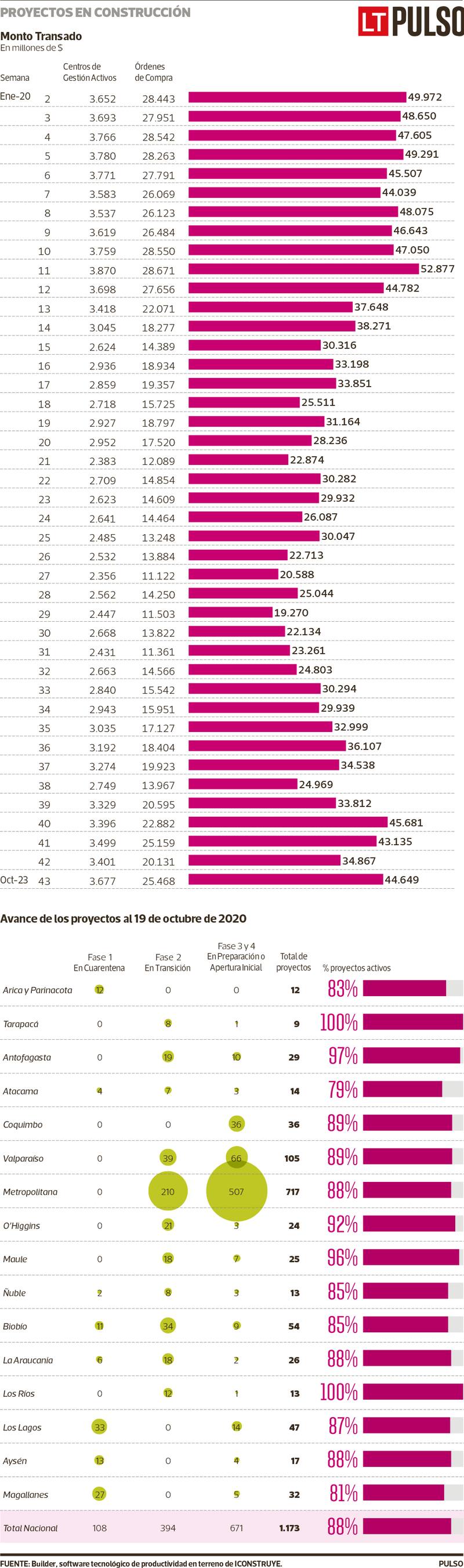 Alentadoras son las cifras que está comenzando a mostrar el sector de la construcción luego de la paralización total de obras debido a la pandemia. De acuerdo con un sondeo realizado por Builder, el software tecnológico de productividad en terreno de Iconstruye, plataforma que trabaja con las principales constructoras del país, al 19 de octubre se reactivaron el 88% de las obras que fueron paralizadas por el coronavirus. Se trata de 1.173 proyectos, de los cuales más de 700 están ubicados en la Región Metropolitana.