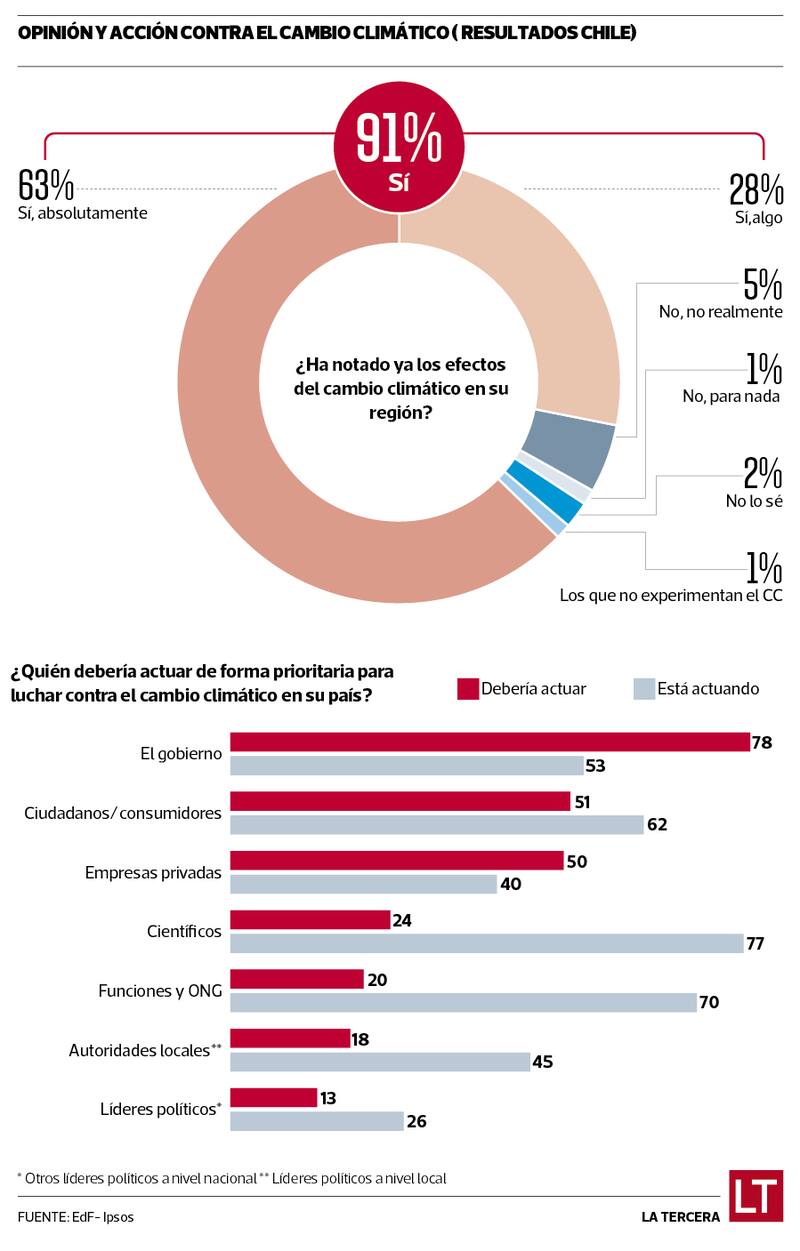 De hecho, el estudio internacional “Observatorio Internacional de Cambio Climático y Opinión Pública 2021″ desarrollado por la empresa estatal francesa EDF e Ipsos, indica que el 91% de los chilenos ha notado los efectos del calentamiento global en su región, superando el promedio de 71% mundial que señala haberlo advertido y, además, el 80% cree que es causado por la actividad humana.