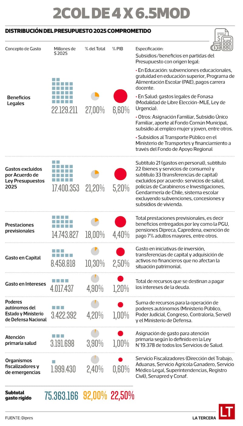 En la respuesta de la Dipres se detalla que un 6,6% del PIB del gasto “rígido” corresponde a beneficios legales, como subsidios y beneficios en diversas partidas del Presupuesto: subvenciones educacionales, gratuidad en educación superior, Programa de Alimentación Escolar (PAE), pagos por carrera docente, gastos legales de Fonasa, asignación familiar, subsidios al transporte público, entre otros. Con un costo de un 4,4% del PIB están también las prestaciones previsionales (PGU, pensiones Dipreca, Capredena, exención de pago del 7% adultos mayores, entre otros). Adicionalmente, están los gastos de capital (inversión pública), lo que representa un 2,5% del PIB; y el gasto en intereses de deuda, con un 1,2% del PIB (ver infografía).