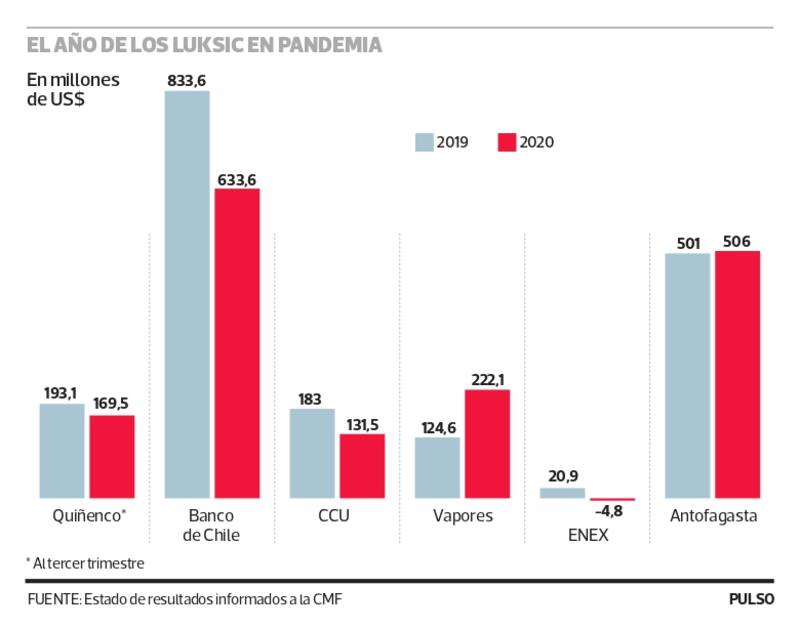 El 2020 será un periodo que el grupo Luksic no olvidará. En el año de la pandemia muchas grandes empresas estuvieron al borde de la quiebra y muchas otras vieron desplomarse sus ventas y utilidades. En cambio, el grupo Luksic fue, probablemente, el que mejor sorteó el peor año en décadas y logró ganancias por casi US$ 1.500 millones de la mano de los buenos desempeños reportados hasta ahora por Vapores, Banco de Chile, CCU -todas filiales del holding Quiñenco- yAntofagasta Minerals, minera liderada por Jean Paul Luksic.