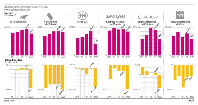 De las 35 empresas, 16 registraron números rojos en los primeros seis meses. Las pérdidas fueron encabezadas por Metro, con $256 mil millones, escoltado de Empresa Nacional del Petróleo (Enap), con $106 mil millones. Enami perdió $48 mil millones, seguido por EFE con $29 mil millones.