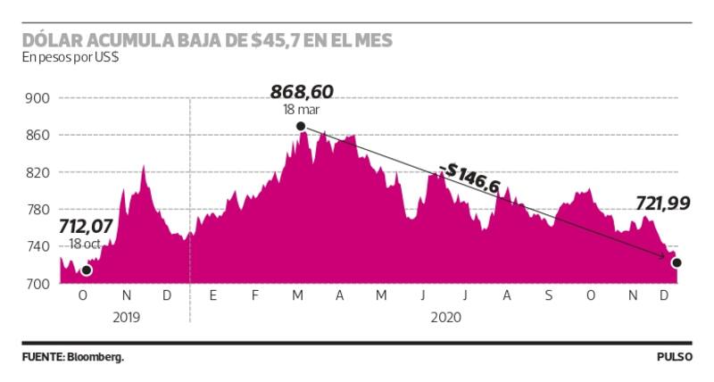 En la sesión de este jueves la divisa cerró en $721,99, su menor nivel desde los $712,07 registrados el viernes 18 de octubre del año pasado. En la sesión del lunes siguiente a los hechos de violencia, la paridad se ubicó en $726.