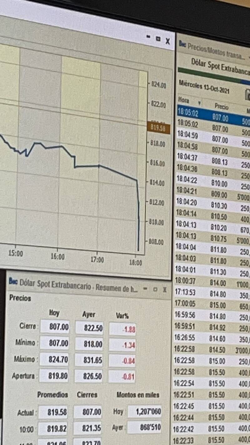 La divisa estadounidense había cerrado las operaciones formales en el mercado interbancario local en niveles de $ 816,50 vendedor (ver gráfico al final), lo que implicaba un fuerte retroceso de $ 7,35 respecto a la jornada previa.