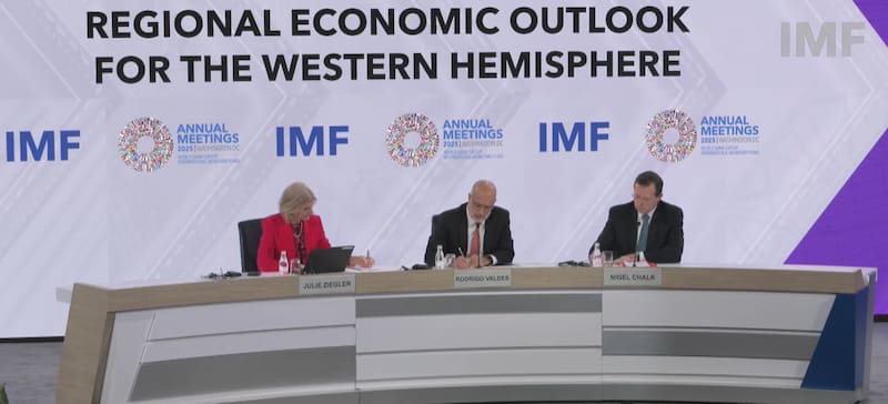 Luego en una conferencia de prensa, Nigel Chalk, el próximo director del Departamento del hemisferio occidental (WHD) del organismo, quien asumirá su nuevo cargo a partir del 27 de octubre de 2025, y en reemplazo del chileno Rodrigo Valdés, comentó que “definitivamente consideramos que la deuda de Chile es sostenible”.
