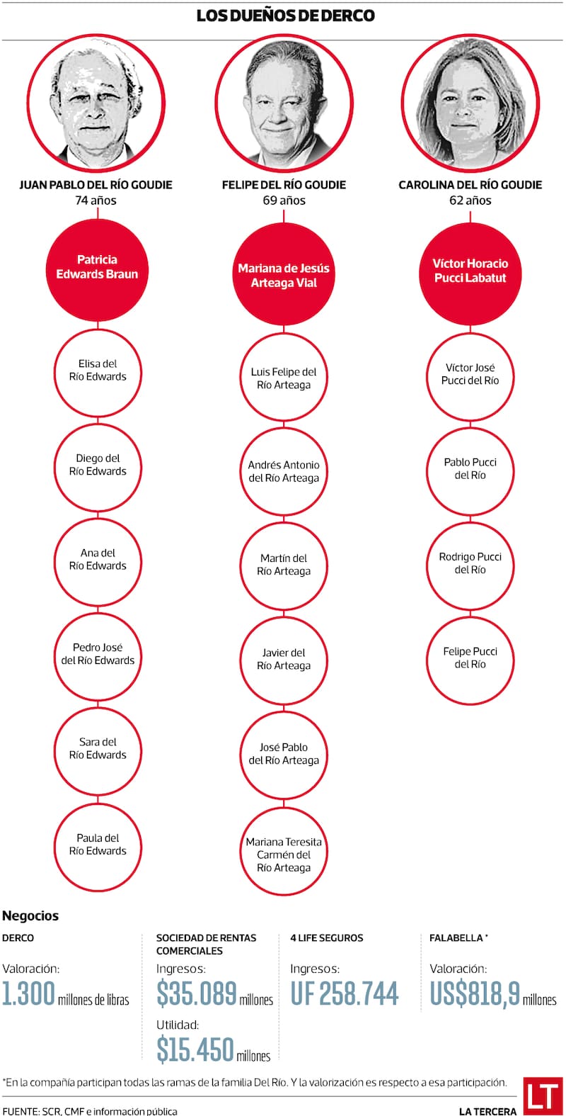 Además de Derco, en conjunto controlan la aseguradora 4 Life y una empresa que posee 31 bienes raíces en siete regiones: Sociedad de Rentas Comerciales. La firma tiene propiedades en arriendo con Walmart y Sodimac, son dueños del mall Puerta del Mar, en La Serena, y han desarrollado dos grandes proyectos inmobiliarios: un edificio de departamentos en Las Condes ya terminado y otro en Vicuña Mackenna 9903, donde pretenden levantar cuatro edificios con 520 departamentos. Los tres, además, son accionistas de Cruzados, la sociedad que gestiona el club deportivo de la Universidad Católica, donde son directores Juan Pablo y el hijo de Felipe, Martín del Río. Además de Guillermo Agüero, otro exgerente general de Sodimac que los acompaña en algunos directorios familiares.