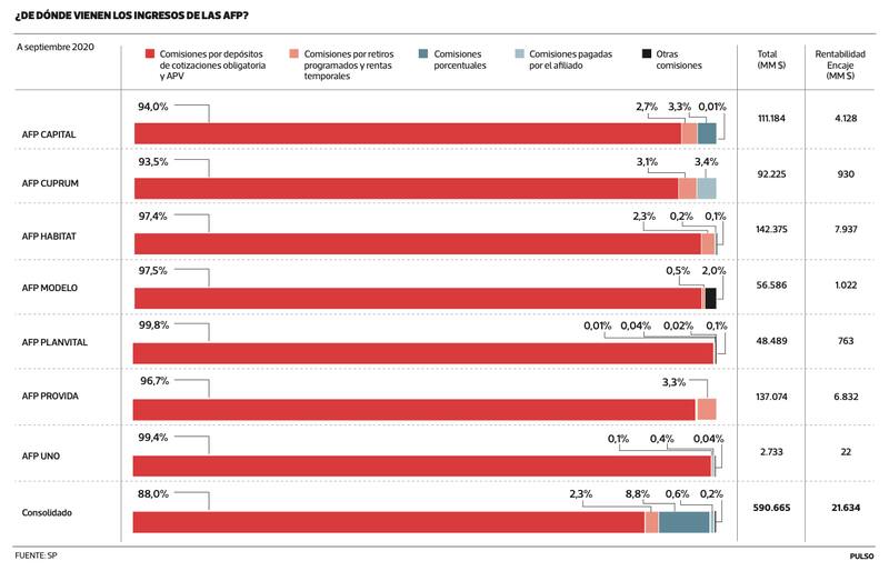 Las AFP han explicado que el retiro del 10%, de unos US$19.000 millones, no impacta en sus ingresos, ya que éstos los obtienen mediante las comisiones que cobran por sueldo, por lo que administrar un menor saldo, en la práctica, no les genera cambios. Además, liberan encaje. El mismo gerente general de la Asociación de AFP, Fernando Larraín, dijo este viernes en radio Duna que los retiros “afectan el monto de pensiones que se entregan, pero respecto de la operativa de las AFP y respecto de los ingresos de las administradoras, no les afecta en nada”. (Ver infografía)