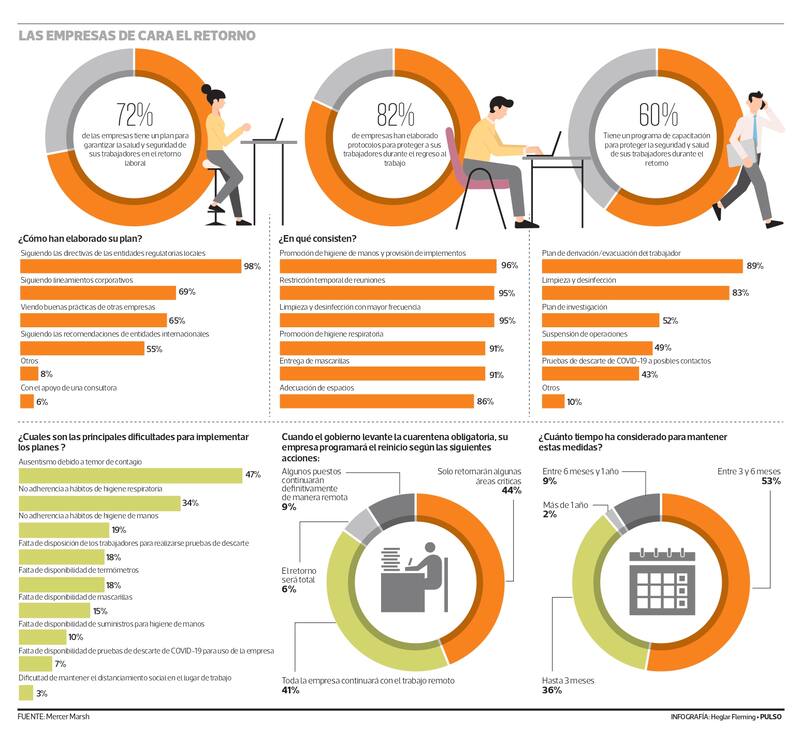 Según un reciente estudio de Mercer Marsh Beneficios, el 72% de las empresas tienen “un plan para garantizar la salud y seguridad de sus trabajadores en el retorno laboral”. Tras casi 150 días de cuarentena y aprendizaje sobre la implementación del trabajo remoto, las empresas ya piensan en abrir sus puertas o retornar a sus labores presenciales luego de que comenzaran a flexibilizarse las medidas de confinamiento.