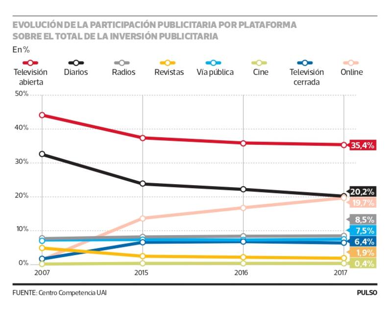 El mercado publicitario chileno modificó su fisonomía por la expansión del mundo digital, y los medios de comunicación tradicionales, que se financiaron históricamente por la venta de espacios publicitarios, cedieron terreno ante el formato virtual. En Chile, la televisión abierta redujo su porción de la torta publicitaria de 44,1% a 35,4% en 10 años y los diarios la bajaron de 32,5% a 20,2%. La publicidad digital, antes inexistente, llegó en 2017 a un 19,7%, según cifras de la Asociación Chilena de Publicidad, que dejó ese año de reportar el peso de este último segmento. La tendencia ha seguido profundizándose. En el mundo, la porción mayor del avisaje digital es capturado por dos grandes actores: Facebook y Google, con al menos dos tercios del mercado en Australia y con el 80% en el Reino Unido.