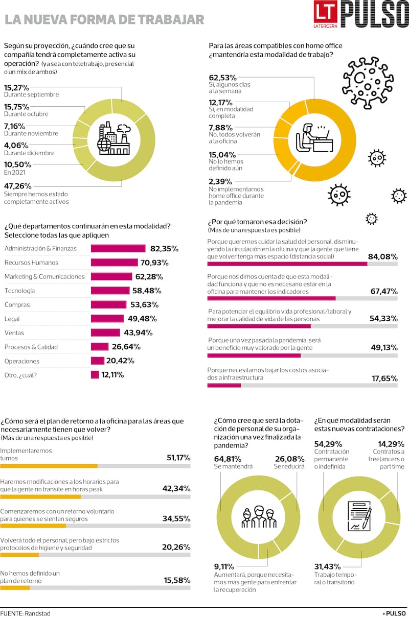 De acuerdo con una encuesta realizada por la consultora de recursos humanos Randstad, a más de 400 tomadores de decisiones de firmas de diferentes sectores en Chile, el 75% de las empresas planea mantener la modalidad de teletrabajo una vez finalizada la pandemia. El 63% lo hará solo algunos días a la semana, mientras que el 12% lo implementará a tiempo completo, es decir, será la nueva forma de trabajar. Además, otro 15% reconoce que aún no ha tomado una decisión al respecto, mientras solo 8% dice que todos los empleados deberán volver a la oficina y 2% no ha implementado teletrabajo en todo este tiempo.
