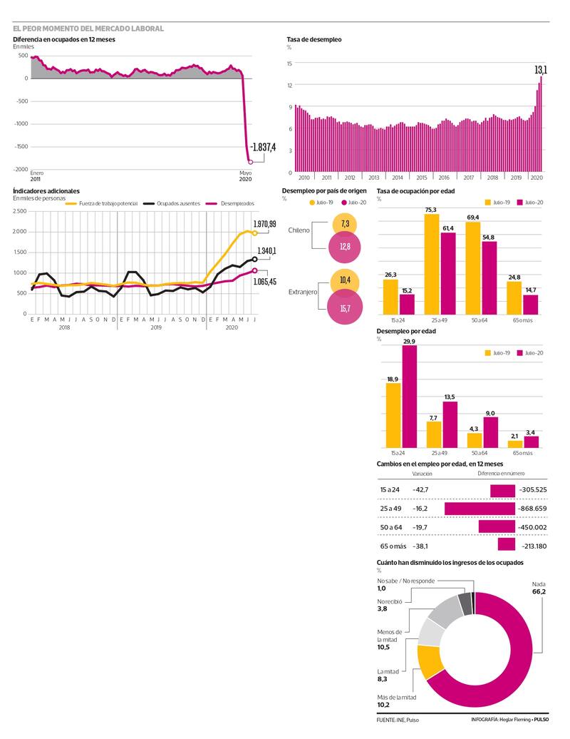 De acuerdo con la Encuesta de Empleo del INE, en el trimestre móvil mayo-julio, durante los últimos 12 meses se destruyeron 1.837.400 puestos de trabajo, lo que equivale a una caída de 20,6%, una baja que no tiene precedentes en la actual serie de datos (que parte en 2010), ni tampoco desde que existen datos de esta variable (1966). Por su parte, la cantidad de personas que salió de la fuerza laboral totalizó 1,5 millones en el mismo período, lo que equivale a un retroceso anual de 15,6%, una cifra también inédita.