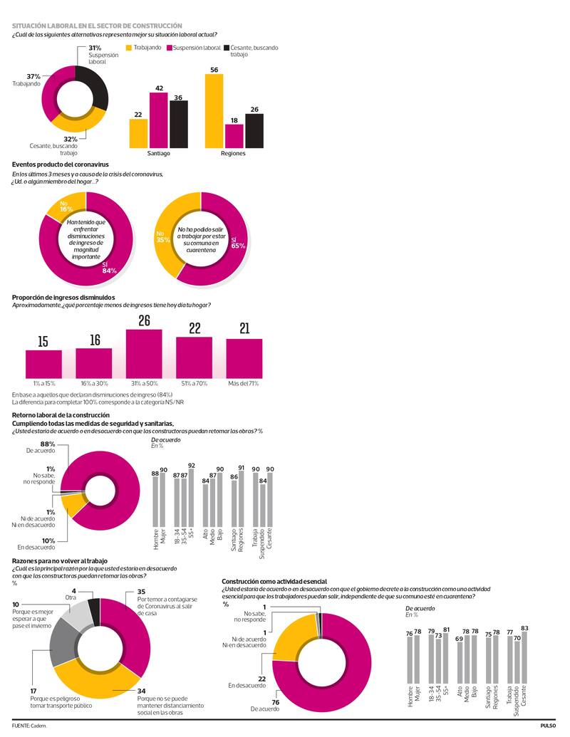 De acuerdo con un estudio de Cadem, el 32% de los trabajadores de este sector declaró estar cesante y el 31% afirmó estar bajo la modalidad de contrato suspendido. A su vez, el 76% se mostró a favor de que este rubro sea esencial.