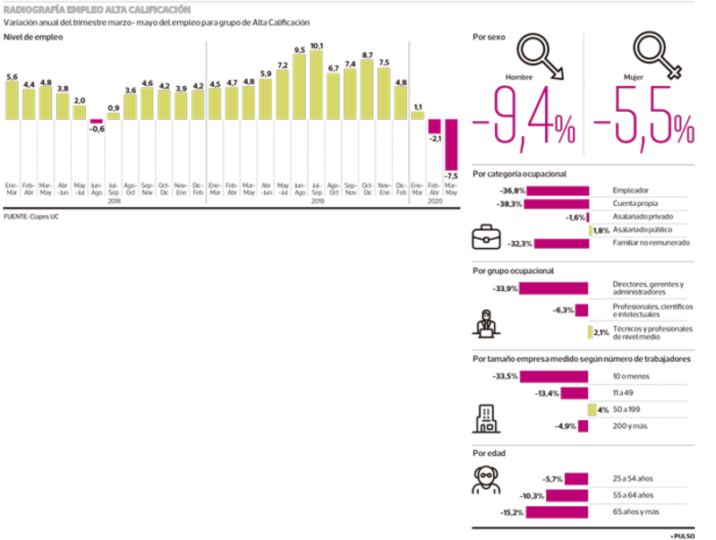 La fuerte caída del empleo impacta a todos los estratos sociales, y si bien los trabajadores con menos años de estudio han sufrido un embate mayor, los más capacitados no han quedado exentos de este agrio panorama contraído en pandemia. Un informe de Clapes UC muestra que la generación de empleos para los trabajadores de alta calificación ha caído 7,5% en el último trimestre de lectura del Instituto Nacional de Estadísticas (INE) de marzo-mayo, la más aguda desde que se mide.