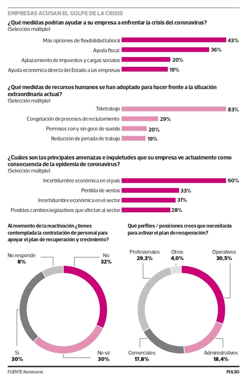 El aplazamiento de impuestos y cargas sociales junto con apoyo económico directo del Estado son parte de las opciones más votadas. Respecto a nuevas contrataciones, el 32% dice que no lo hará, mientras que un 30% dijo que sí.