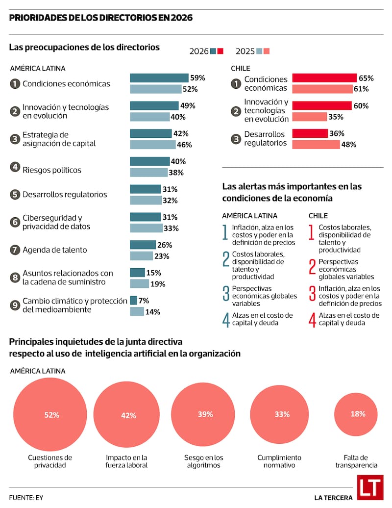 En momentos de extrema incertidumbre mundial y de volatilidad de los mercados producto del alza del petróleo y el conflicto armado en Medio Oriente, un estudio de EY revela las principales preocupaciones y prioridades de los directorios de empresas en Chile, Brasil, Colombia y México para este año 2026.